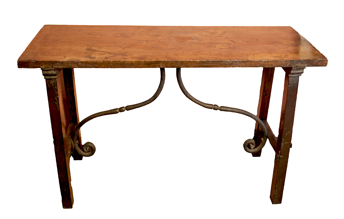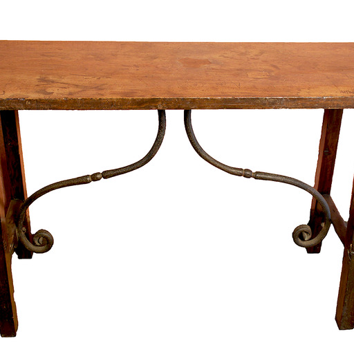 Walnut wood table with S-shaped iron fasteners