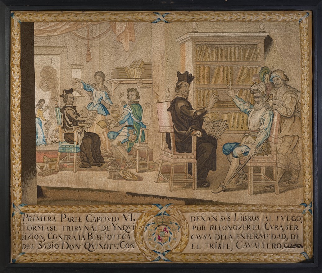 Kixotearen lehen zatiko VI. kapituluaren antzezpena: "Del donoso y grande escrutinio que el cura y el barbero hicieron en la librería de nuestro ingenioso hidalgo". Eszena protagonistaren etxeko liburutegian garatzen da, On Kixote bere lehen eta zoritxarreko irteeratik itzuli eta berehala. Ekintzaren zatirik handiena hondora doa: apaizak eta bizarginak, eserita, erre beharreko liburuak aukeratzen dituzte, izenburuz izenburu. Kixoteren ilobak leiho batetik botatzen ditu liburu kondenatuak, etxekoandreak beheko solairuko patioan pizten duen sutara bota ditzan. Eszena xingola urdinez apaindutako zuhurtasun batez markoztatuta dago. Behealdean, azalpen testua, errege armarri baten aldean.