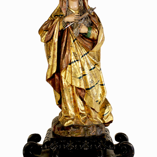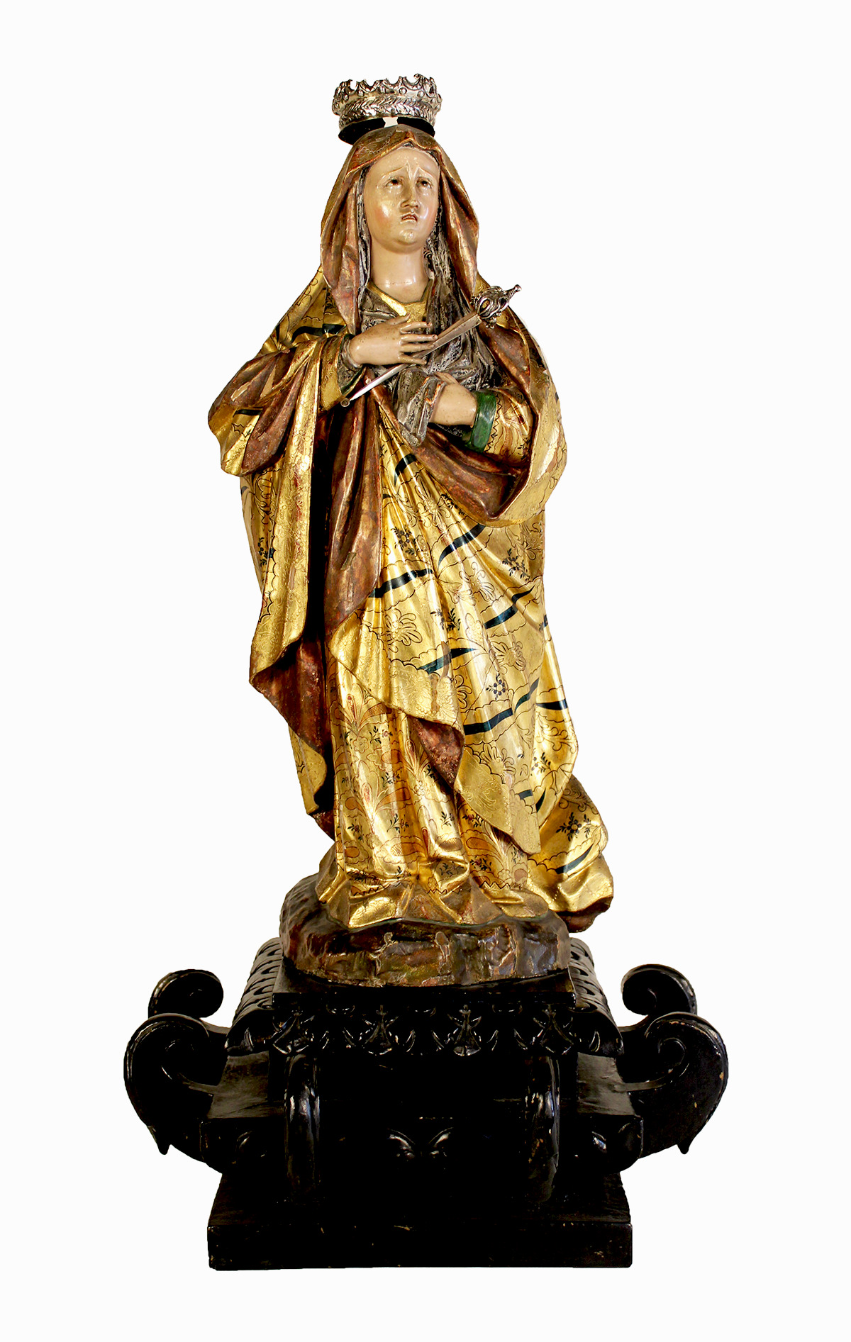 A carved, polychrome, gilded, and embossed wood sculpture. The Virgin',s face, slightly raised, with a sad gaze turned toward heaven, accompanied by her hands with their fingers interlaced in a gesture of supplication, expresses affliction and sorrow. On her head, she wears a silver crown. She rests on a pedestal with eight black scrolls.