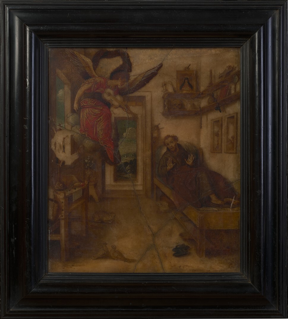 The scene is based on a story by Bonaventure, the first biographer of Saint Francis. Francis was very ill and longed to listen to music, but there was nothing to please him. One night he was meditating when he suddenly heard a beautiful melody and was filled with such happiness that he seemed to have already left this world. The encounter takes place in a bedroom. Saint Francis is lying on his bed, his gaze turned toward the angel who has just appeared to him and who has come to comfort him with his music. The saint has his palms extended in admiration. A desk under the window on the left, some shelves above the bed, and various religious objects (paintings, crucifixes, a skull, etc.) complete the decoration. On the floor, the figures of a cat and two doves can be seen, as well as the saint',s sandals. The composition is subject to strict perspective. The vanishing lines tend to converge in the landscape that can be seen beyond the door at the back of the room.