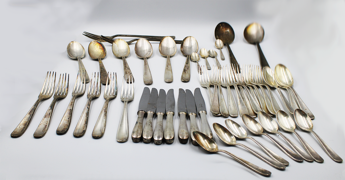 Conjunto de cubiertos: Cucharón I: 1 Cucharón II: 1 Tenedor de servir: 2 Cuchara sopera: 6 Tenedores de carne: 6 Tenedores de postre: 11 Cuchillos: 7 Cuchara de postre: 3 Cucharilla de postre: 7 Cucharilla de café: 4