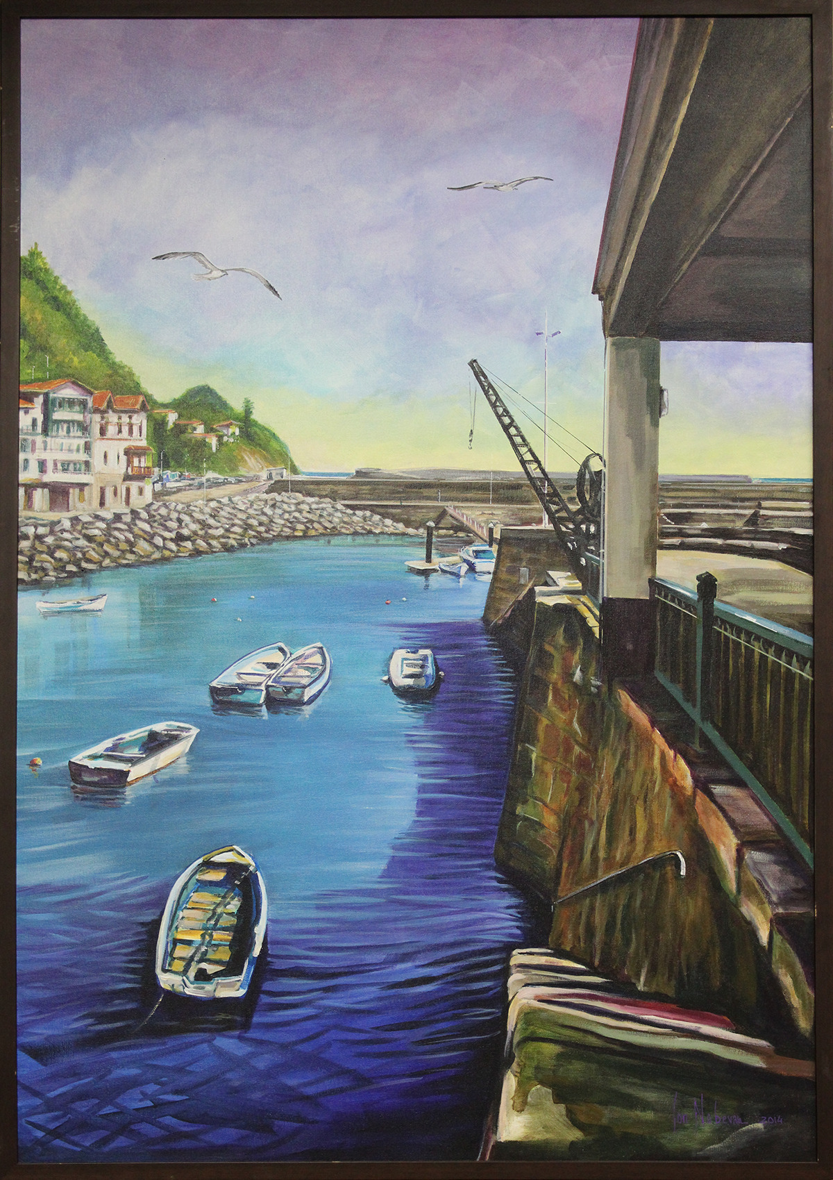 Este cuadro representa una escena portuaria con una paleta de colores contrastados. Se aprecia el puerto de Mutriku con varias embarcaciones flotando en aguas de un azul profundo junto con un fondo compuesto por casas y una colina verde.