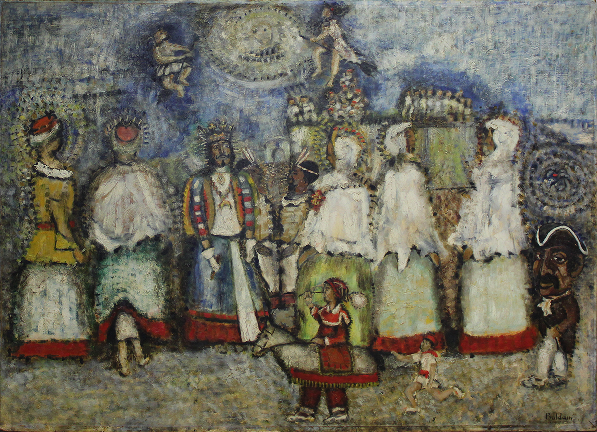 Konposizio nagusia erraldoi eta buruhandien batzuk irudi irudikatzen da, atzealdean, jantzi tradizionalez jantzitako beste batzuk ere bai, jai-giroko eszena batean. Pintzelkada lodiak erabiltzen dira obra egiteko, akabera irregularra eta materikoa definitzeko. Hori kolorea nagusitu da eta kolore ilunagoetan irudikatutako pertsonaiak kontrastatzen da.