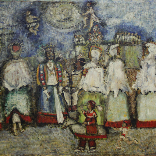The main composition depicts several figures of giants and big-headed figures, as well as others in the background dressed in traditional costumes, in a festive scene. The work is executed with thick brushstrokes that create an irregular, material finish. Added to this is the predominance of yellow, which contrasts with the figures depicted in darker colors.