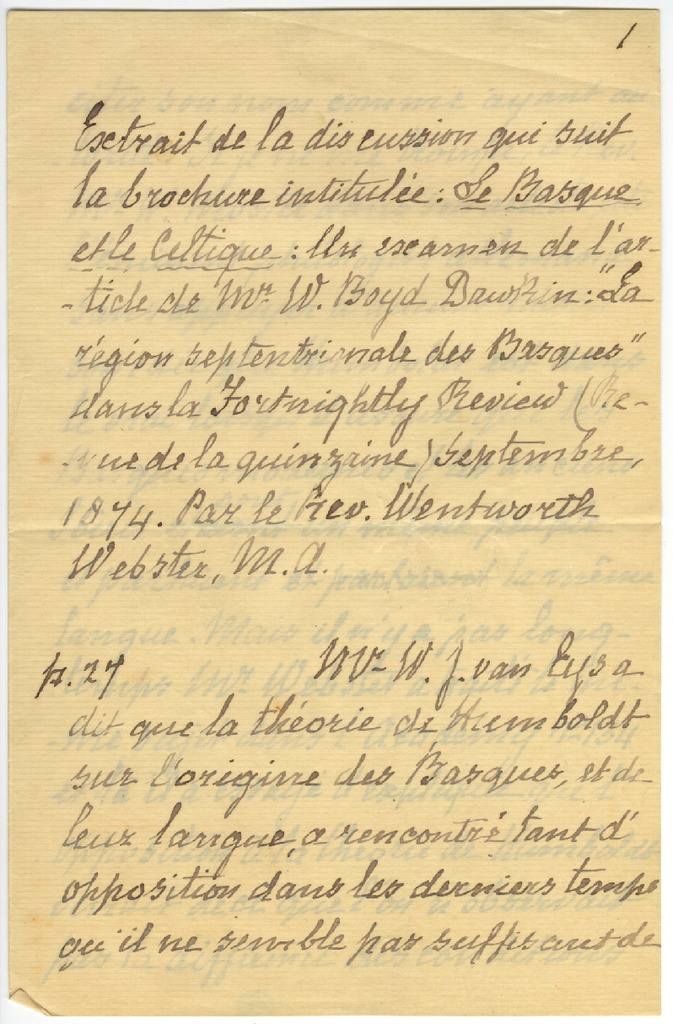 91. EYS, Mathilde van - Extrait de la discusion qui suit la brochure intitulée: le basque et le celtique: Un examen de l’article de Mr. W. Boyd Dawkin: “La région septentrionale des basques” dans la Fortniqhtly Review, 1874. Par le Rev. Wentworth Webster
