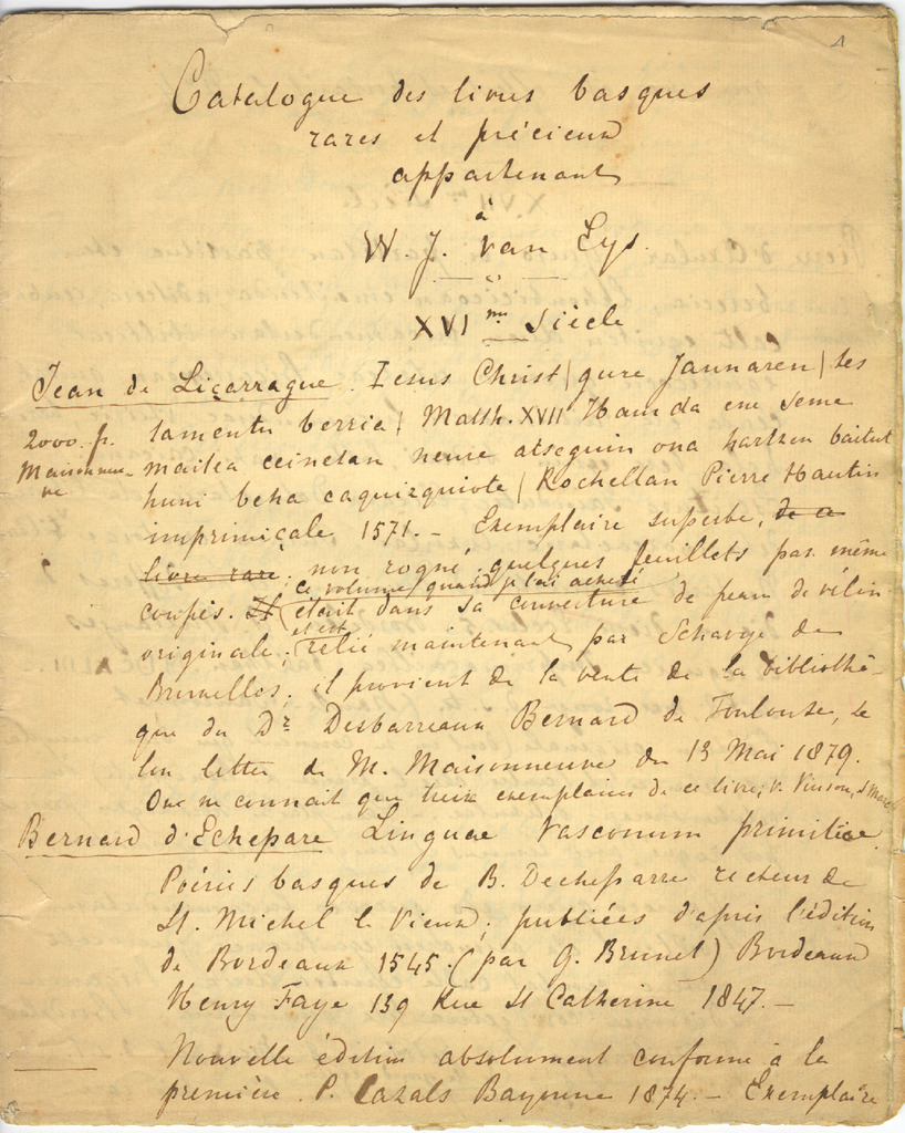 61. EYS, W. J. van - Catalogue des livres basques rares et précieux appartenant a