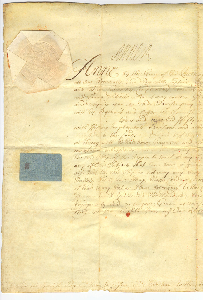 33. 1709. Ana Stuart Erreginak, Santiago Ansotegi kapitainari baimena balearen arrantzarako Irlandako Kostaldean