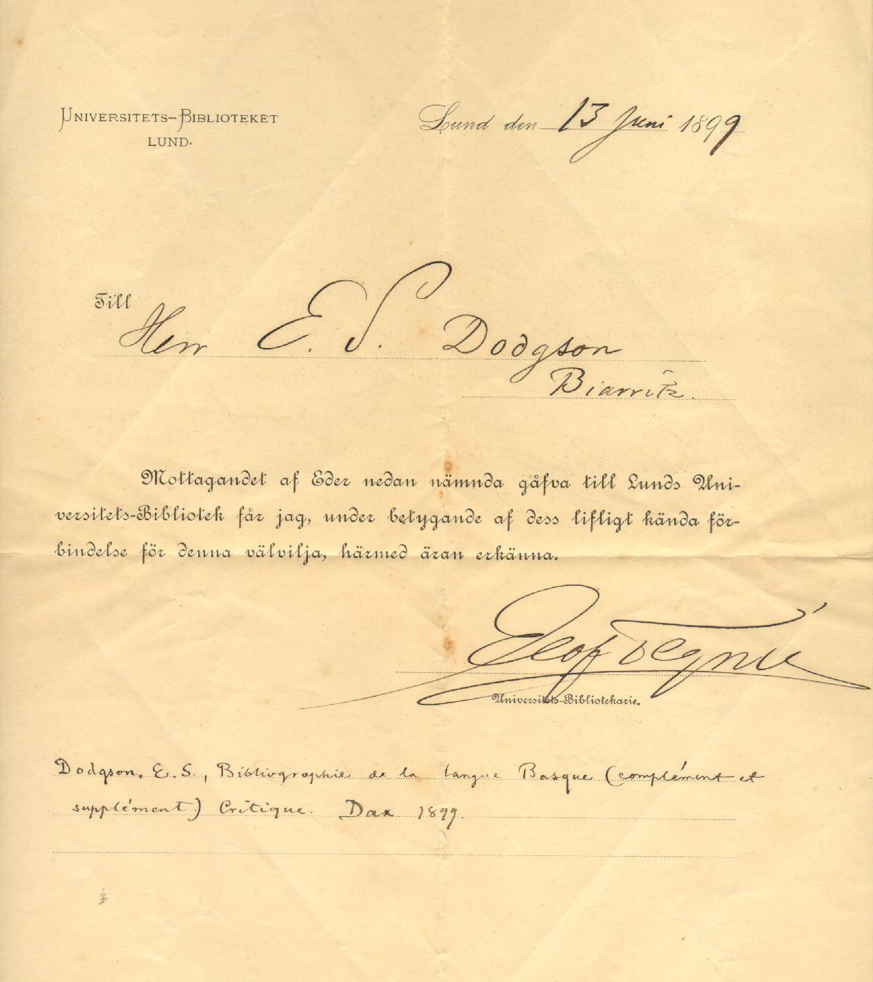 43. UNIVERSITETS-BIBLIOTEKET LUND - E.S. Dodgson-i 1899