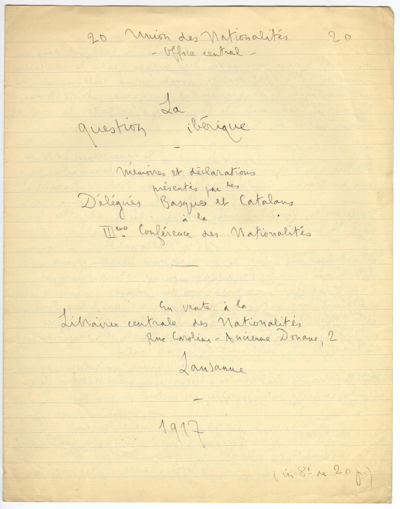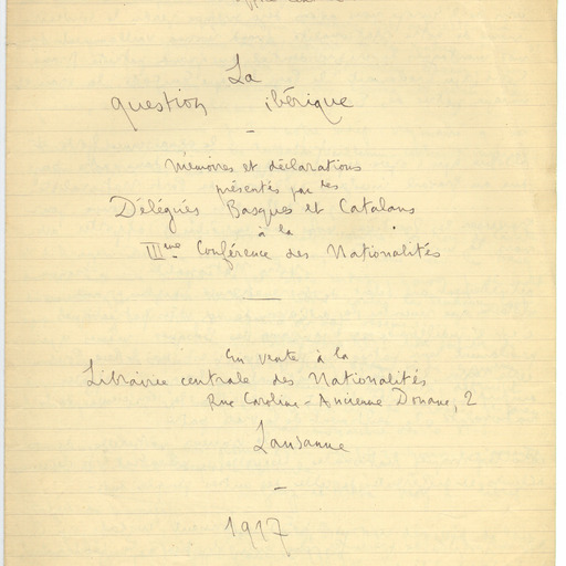 91. LACOMBE, G. - La question ibérique. Mémoires et déclarations présentés par les Délégués basques et catalans a la IlIeme Conférence des Nationalités. 1917