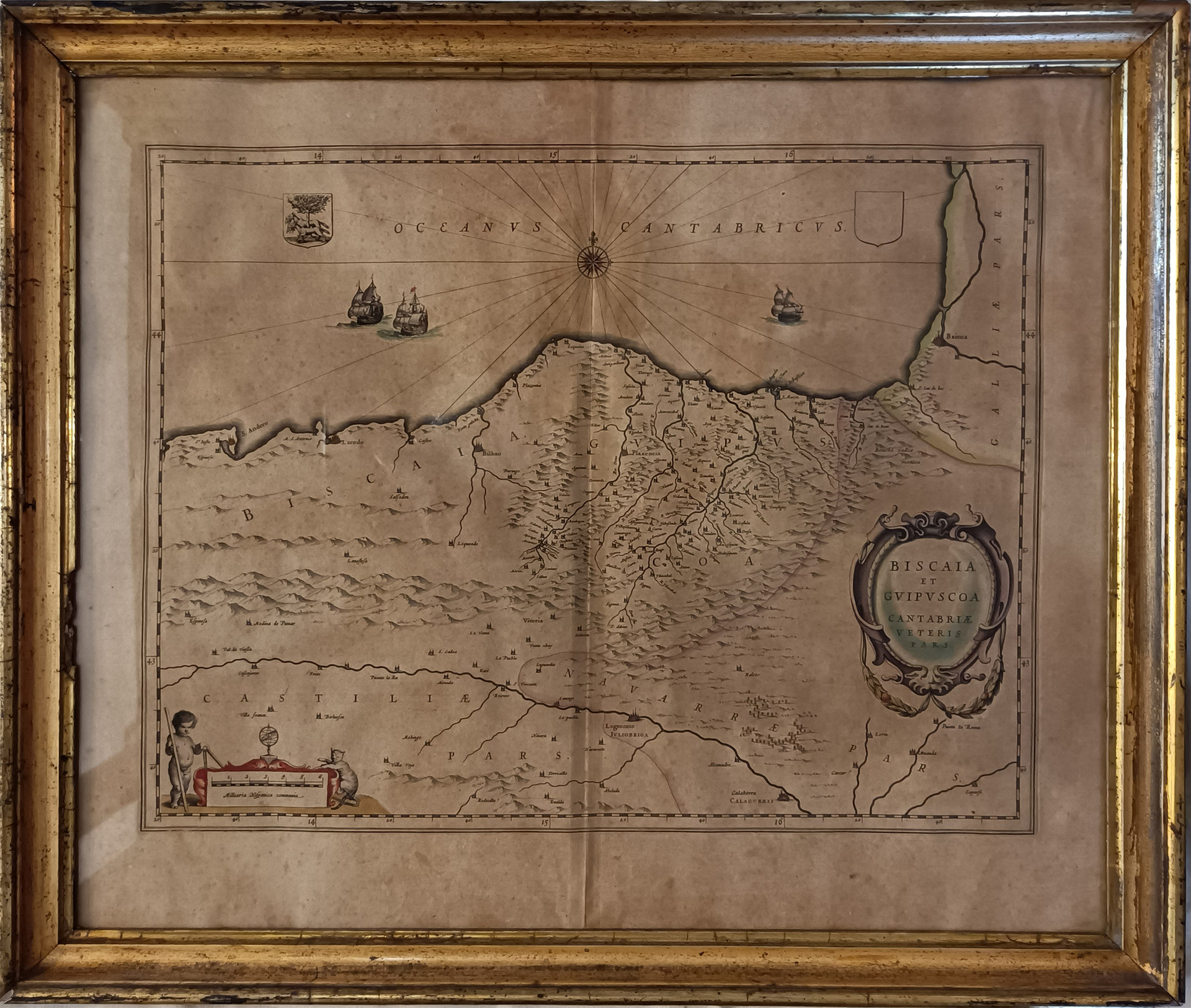 It depicts the Cantabrian coast of present-day Euskal Herria, as well as part of Castile. It is an original coloured engraving from circa 1650, published by the Dutch cartographer and publisher Johannes Janssonius. In the lower right corner there is a shield containing the inscription BISCAIA ET GUIPUSCOA CANTABRIAE VETERIS PARS. In the lower left corner there is a scale, which a naked child measures with a compass, while in the other hand he holds a large ruler.