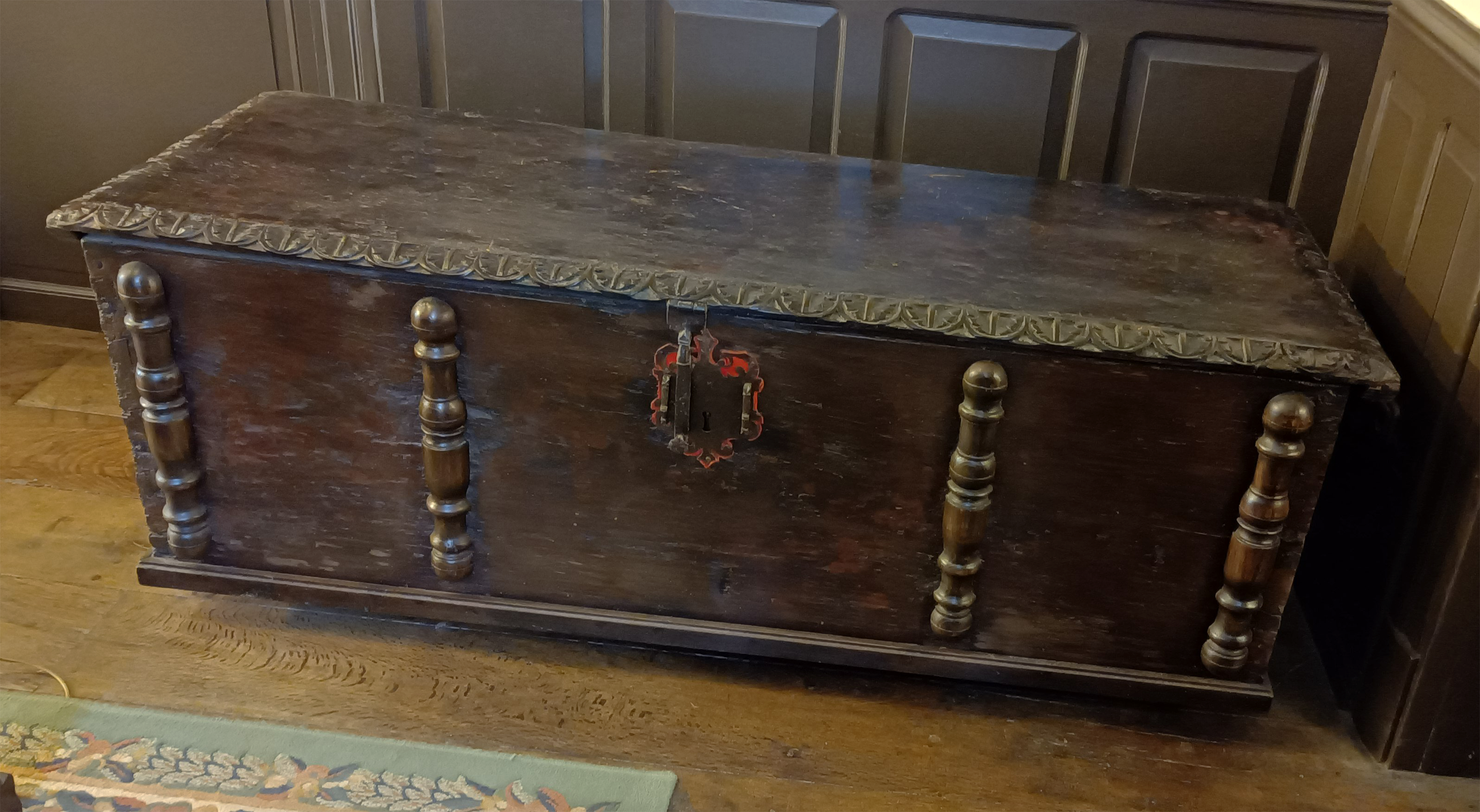 Walnut wood storage chest with hinged lid and iron lock. Keeps the key. Front decorated with 4 semi-balusters. Small compartment inside.