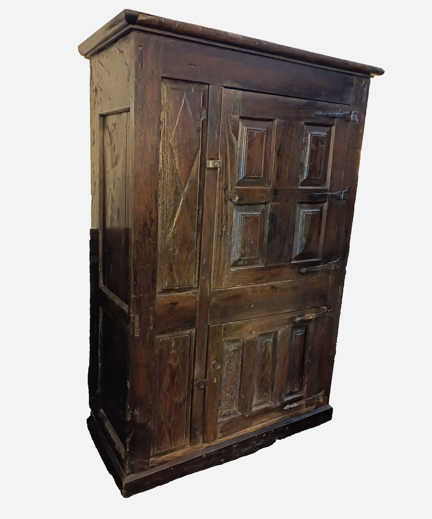 Wardrobe with two doors and two shelves inside. It has a lock on each door, which has been replaced by modern ones. Wooden pins on both doors.
