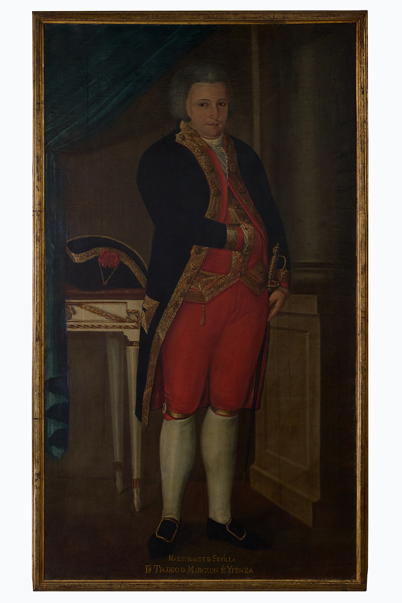 Full-length portrait of Don Tadeo de Monzón e Ypenza, husband of Doña María de Las Mercedes de Olasso y Abaría, whose portrait forms a pair with this one. He has been portrayed in an elegant room in which, as a significant detail, the presence of a neoclassical console table stands out, which is still preserved in the main room of Olaso Tower, in Bergara. Don Tadeo wears a uniform consisting of a blue jacket with red and gold border, a red waistcoat with gold border and red tights.