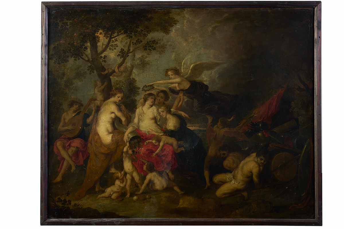Several mythological figures glorify peace in this depiction. In the center of the image, the goddess of Peace, dressed in a red cloak wrapped around her hips, is crowned with a laurel wreath by the goddess Victoria, Concordia. Peace is embraced by "Concordia," recognizable by the ancient lictor',s beam, and in front of her, in a blue dress, we can see "Justice," holding the scales as her own attribute. To the right of Peace, Abundance pours her cornucopia over the children playing on the ground as a sign of the abundance of peacetime. To the left of the group, Mercury, the messenger of the gods and lord of commerce, plays his lute. The happy and contemplative scene of the consequences of peace---happiness, prosperity, and security---contrasts the right edge of the painting, in muted gray colors, with a pile of armor, weapons, banners, and war drums, and the naked and bound prisoners of war. Above, the sky darkens. A winged warrior fury turns against the goddesses with a flaming torch, but Peace repels it with the caduceus, Mercury',s staff.