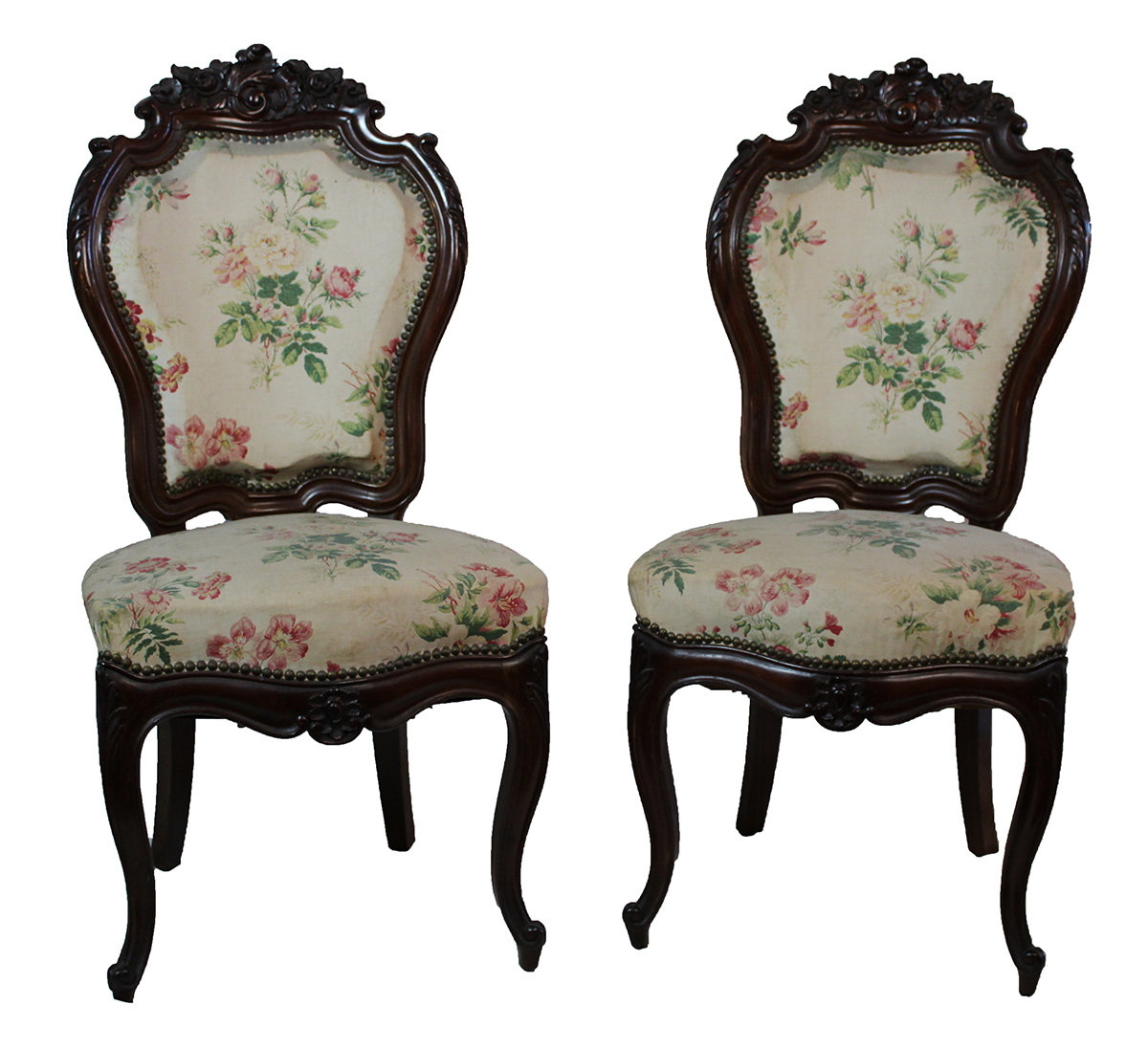Pareja de sillas de estilo isabelino en madera tallada. Asiento y respaldo tapizados.
