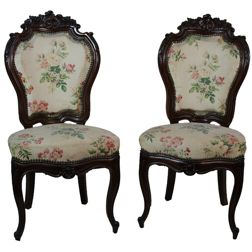 Isabeldar estiloko aulki parea zur landuan. Tapizatutako eserlekua eta bizkarraldea.