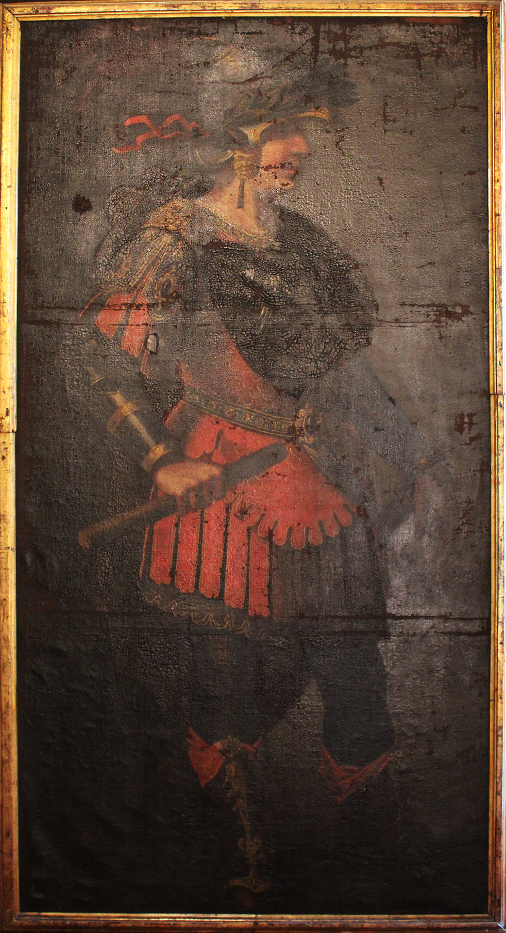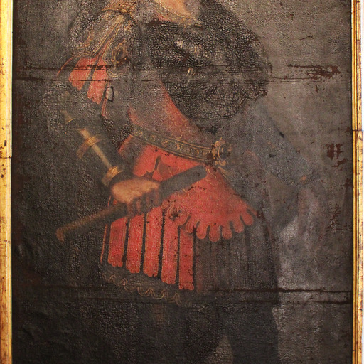 Retrato idealizado de cuerpo entero y de gran formato del conquistador Alejandro Magno. Se le representa de perfil, mirando hacia la derecha, ricamente ataviado con indumentaria militar, a la romana. Sujeta con su mano derecha un rollo o bastón de mando. En la parte superior derecha, casi perdido: ALEJANDRO MAGNO.