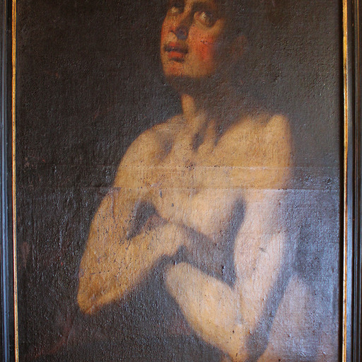 Half-length scene of Saint John the Baptist. Against a dark background, the saint',s naked torso is depicted in his youth. His arms are crossed over his chest and his eyes are looking heavenward, in a contemplative attitude. The most striking feature is the brightness and intensity with which his gaze is rendered. At the top, an inscription in red letters identifies the saint.