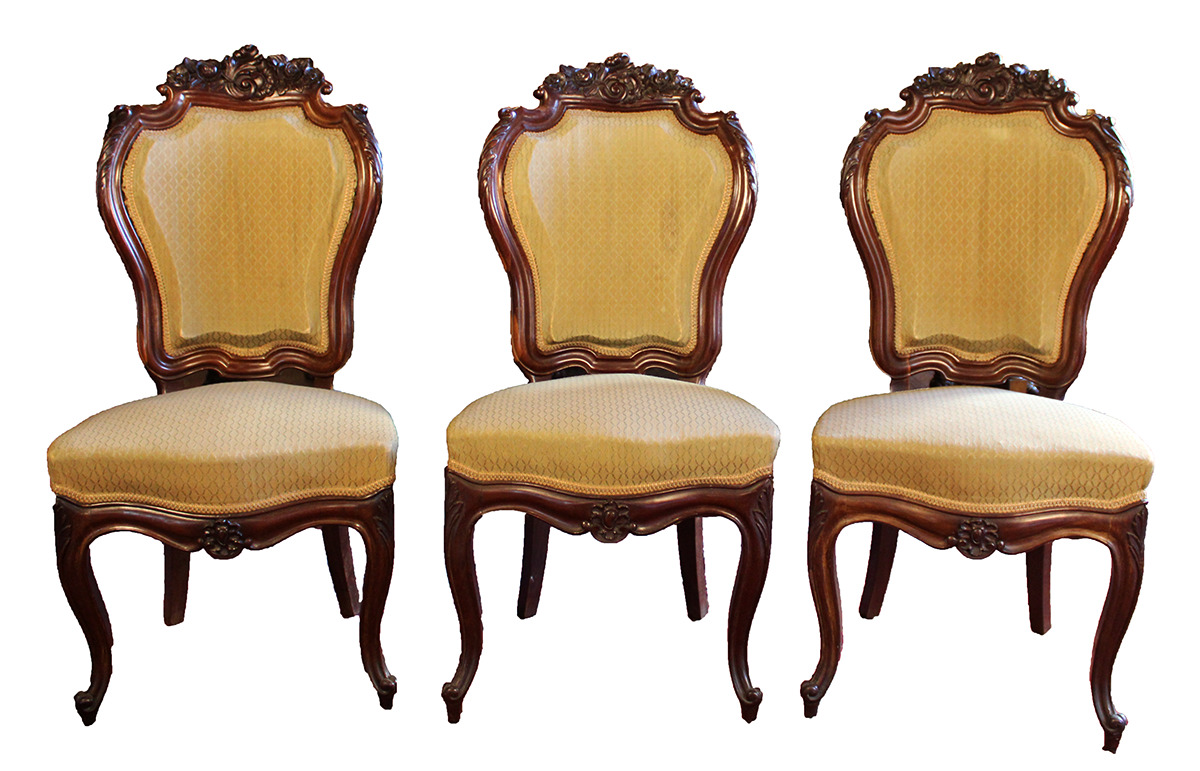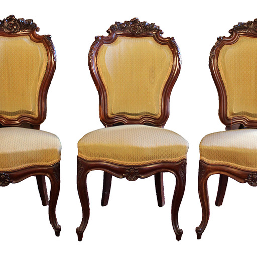 Jangelako hiru aulki isabeldar, zur landuz eginak eta tonu hori argian tapizatuak.