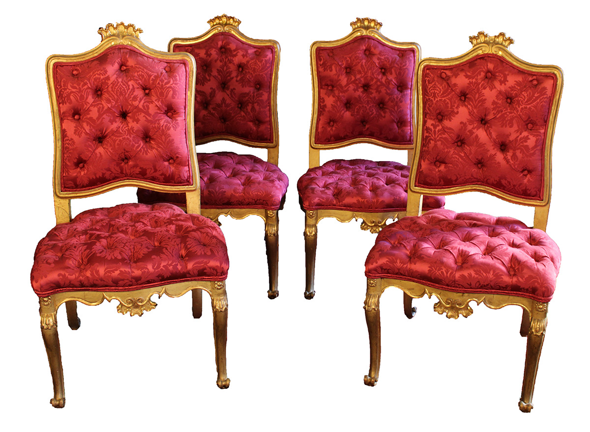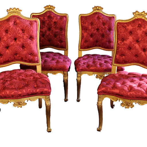 Conjunto formado por cuatro sillas de estilo rococó en madera tallada y dorada. La labor de talla se concentra especialmente en los copetes y faldones de cada silla y también en las patas "cabriolé". Respaldos y asientos con tapizados "capitoné" en seda de color fucsia.