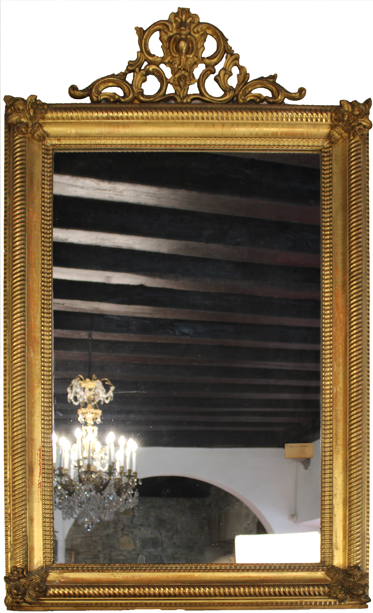 Irudi angeluzuzeneko ispilu isabeldarra, zur landuan eta urreztatuan egina. Ertzetan kordoi paraleloak eta lis-loreak ditu perimetroan apainduta. Orri-formako kopetea.