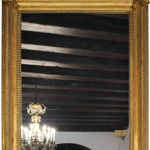 Rectangular Elizabethan mirror in carved and gilded wood. Surrounding decoration is a parallel cord with fleur-de-lis in the corners. Leaf-shaped crest.