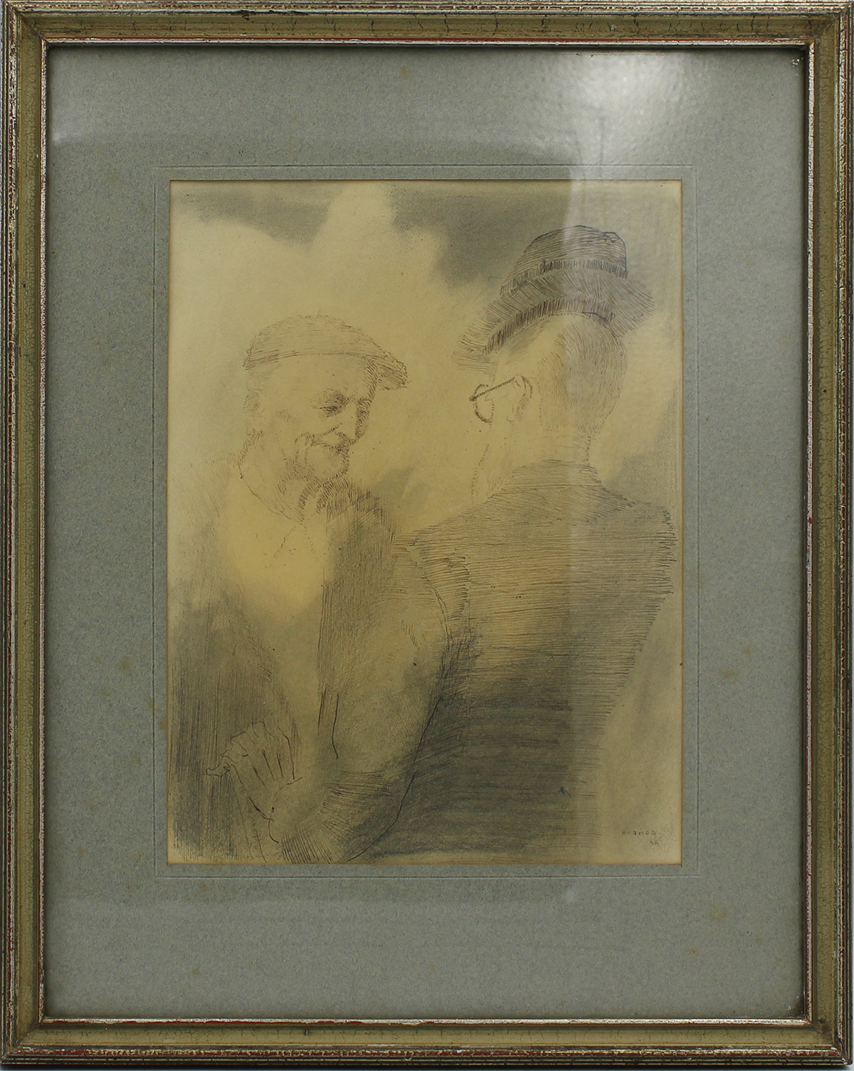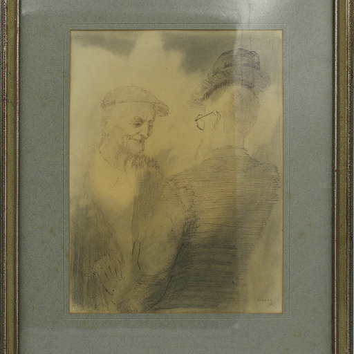 Dos hombres mayores inmersos en una conversación de apariencia cercana y cordial por el lenguaje expresivo que presentan. Sobre la estética de las figuras, la de la derecha tiene un aspecto más formal en comparación con la otra figura.