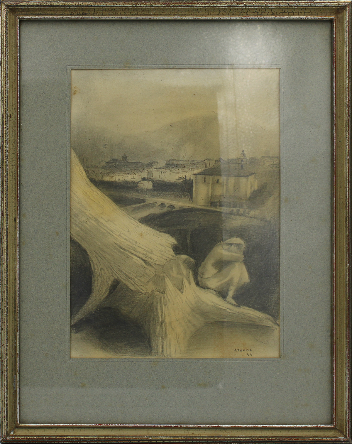 Lehen planoan, figura bakartia enbor urratu baten gainean agertzen da. Gizakia uzkurtuta dago burua belaunen gainean jarrita. Atzeko planoan pasaia dago bide batekin eraikin multzo baterantz, haien artean, eliza bat bereizten da.