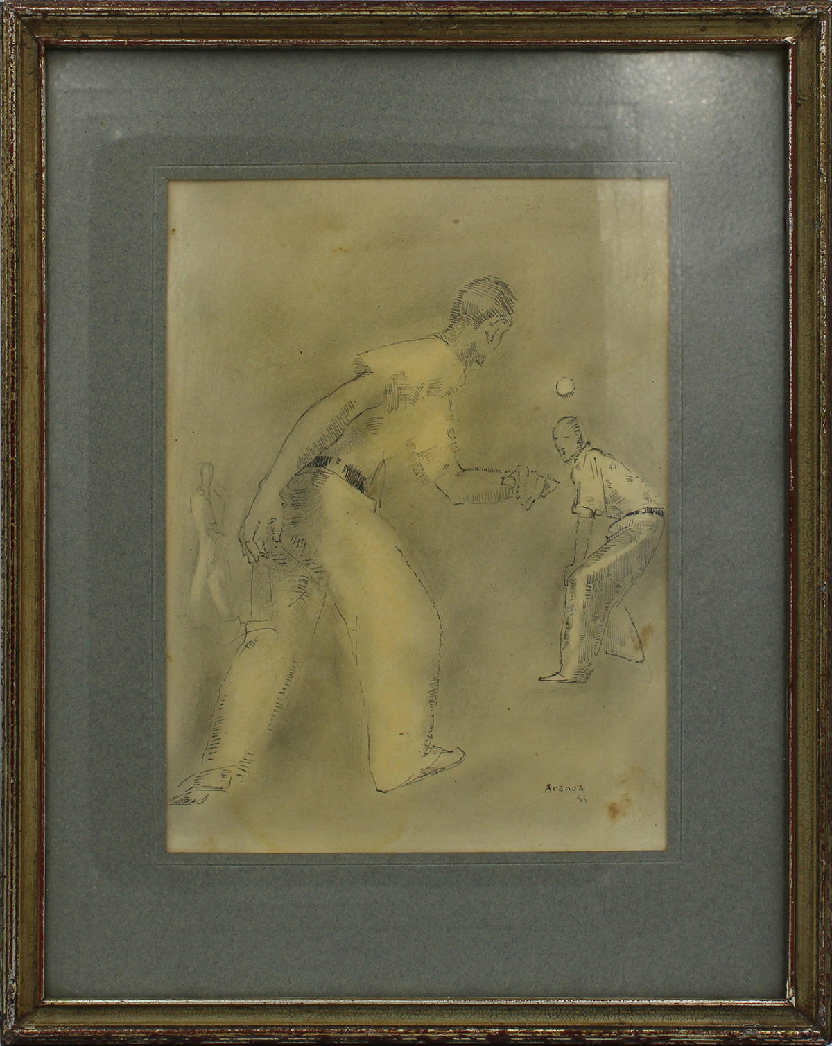 This drawing by Aranoa shows two pelotaris playing handball. The man in the foreground, with his back to the ball, is preparing to serve, while his opponent, facing him, waits to respond. They are dressed in the traditional style, in white and wearing a sash. A third figure in the background watches the game. The scene is signed and dated in the lower right corner.
