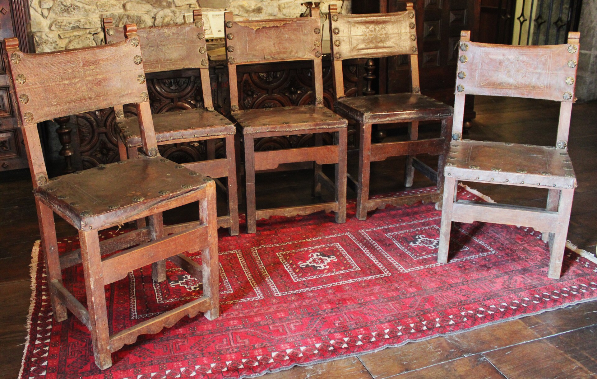 A set of five rustic chairs. The legs are joined by smooth crossbars and the backrest is made up of two stiles with scrolled ends. The seat and back are made of leather.