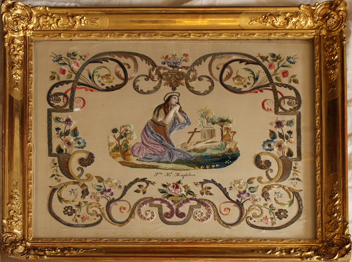 Bordado en filoigrana de hilos de diferentes colores que muestra a María Magdalena penitente. La santa se encuentra en el centro, rodeada por una bordura de motivos geométricos y de flores.