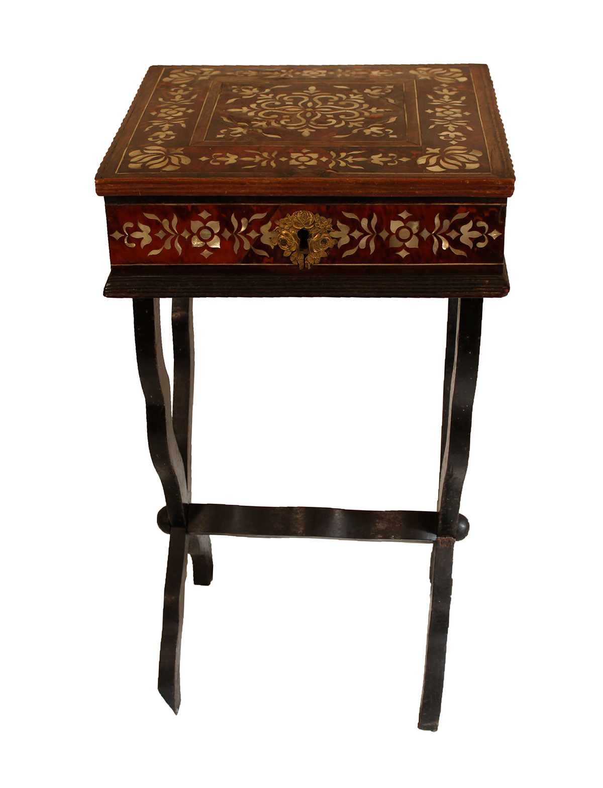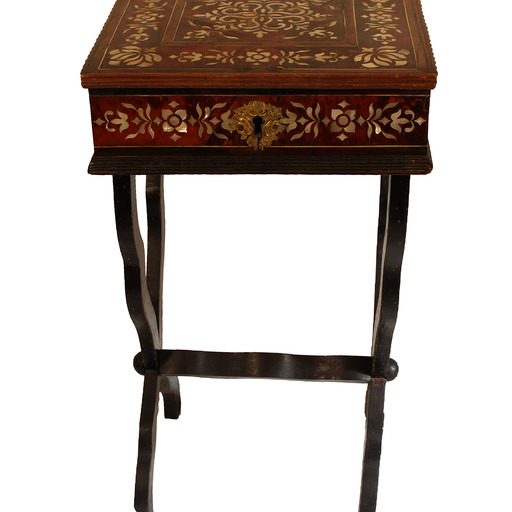 Wooden sewing box decorated with tortoiseshell and mother-of-pearl marquetry. Scissor legs and interior upholstered in floral-patterned fabric.