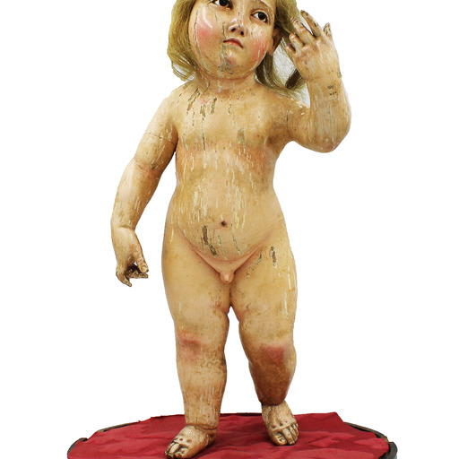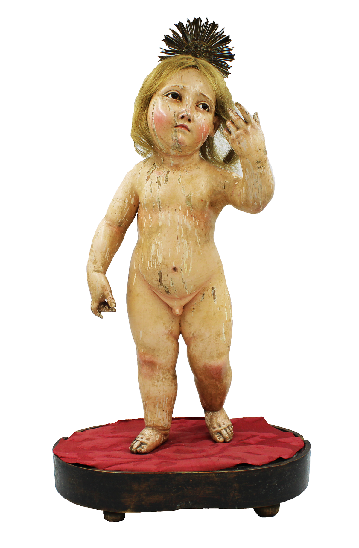 - es Talla de vestir policromada del Niño Jesús. Tiene pelo rubio natural y lleva una coraona de plata.