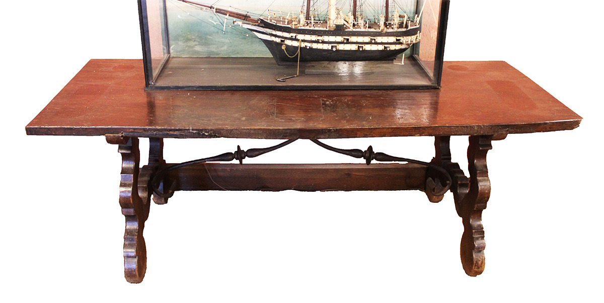 A popular example of a table with lyre legs that was introduced to Spain and France from Italy. It has a slightly curved edge, cut-out supports, and S-shaped fasteners.