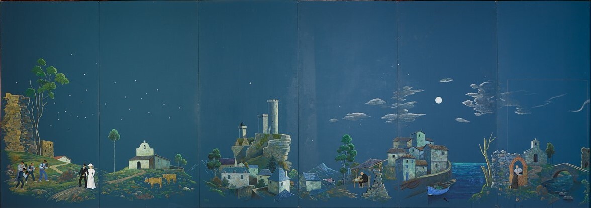 A series of six painted panels that form what appears to be a single continuous scene, although in reality, it is made up of six scenes that can be read separately. The last panel is smaller than the rest and is cut to access the electrical panel. From left to right: 1. Newlywed couple with "musicians" and a background of tower ruins. 2. Rural hermitage with a pair of cows. 3. Villa and castle on a rock in the background. 4. Writer under a shed. 5. Fishing port with boats in the foreground. 6. Landscape with a hermitage, river, and bridge, and, in the foreground, a confessional with a priest and parishioner having confession.